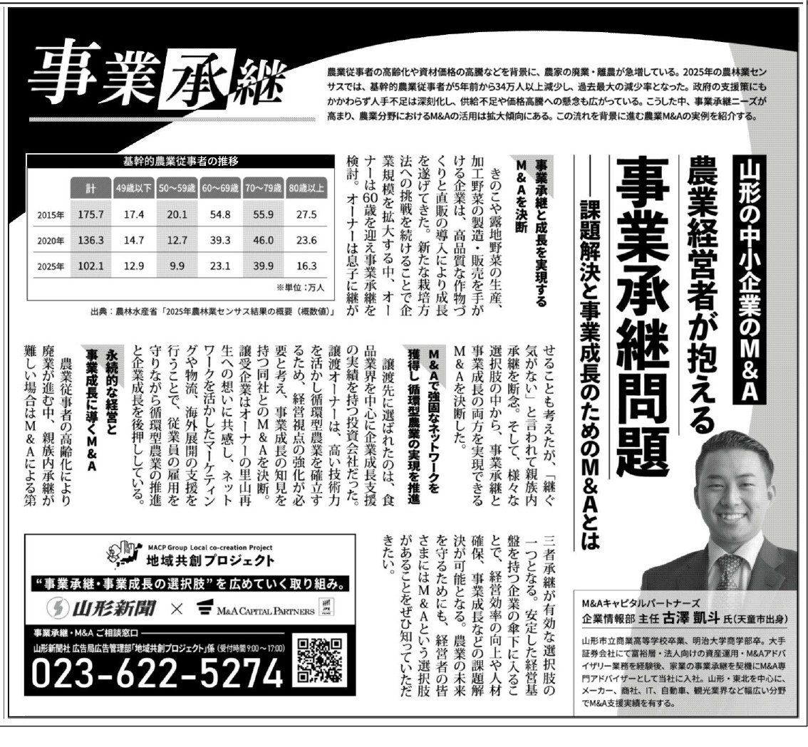 山形新聞社とM&Aキャピタルパートナーズ(MACP)が共同で進める「地域共創プロジェクト」。本連載では、MACP企業情報部の古澤凱斗さん(天童市出身・山形市立商業高校卒)が、データと実例を交えて山形の中小企業がとるべき戦略を解説します。 第3回となる今回は、本県の基幹産業である「農業」が抱える事業承継問題に焦点を当てます。