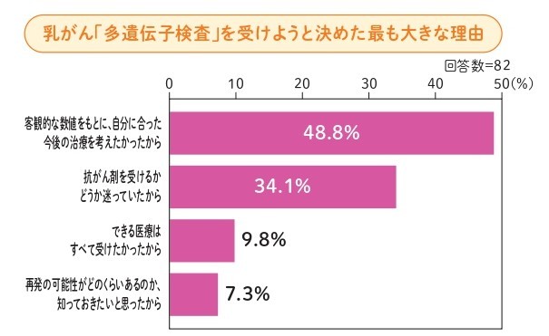 乳がん患者さんがこの検査を受けようと思った最も大きな理由は、「客観的な数値をもとに、自分に合った今後の治療を考えたかったから」が48.8%。次に「抗がん剤を受けるかどうか迷っていたから」が34.1%でした。(EXACT SCIENCES調べ)