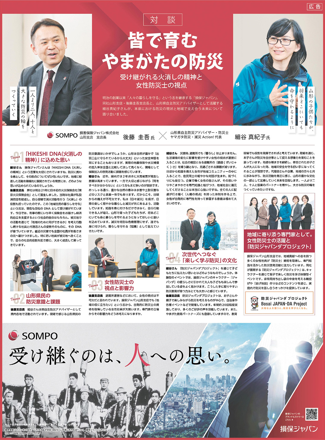 「山形は災害が少ないから大丈夫」——そんな“安全神話”を乗り越え、地域の命を守るためには何が必要でしょうか。明治時代から続く「火消し」の精神を継承する損保ジャパン山形支店の後藤圭吾支店長と、地域に根差した「日々減災」を提唱する細谷真紀子さん。それぞれの最前線で活動する二人が、山形の防災の現状と、次世代へつなぐ未来を語り合いました。