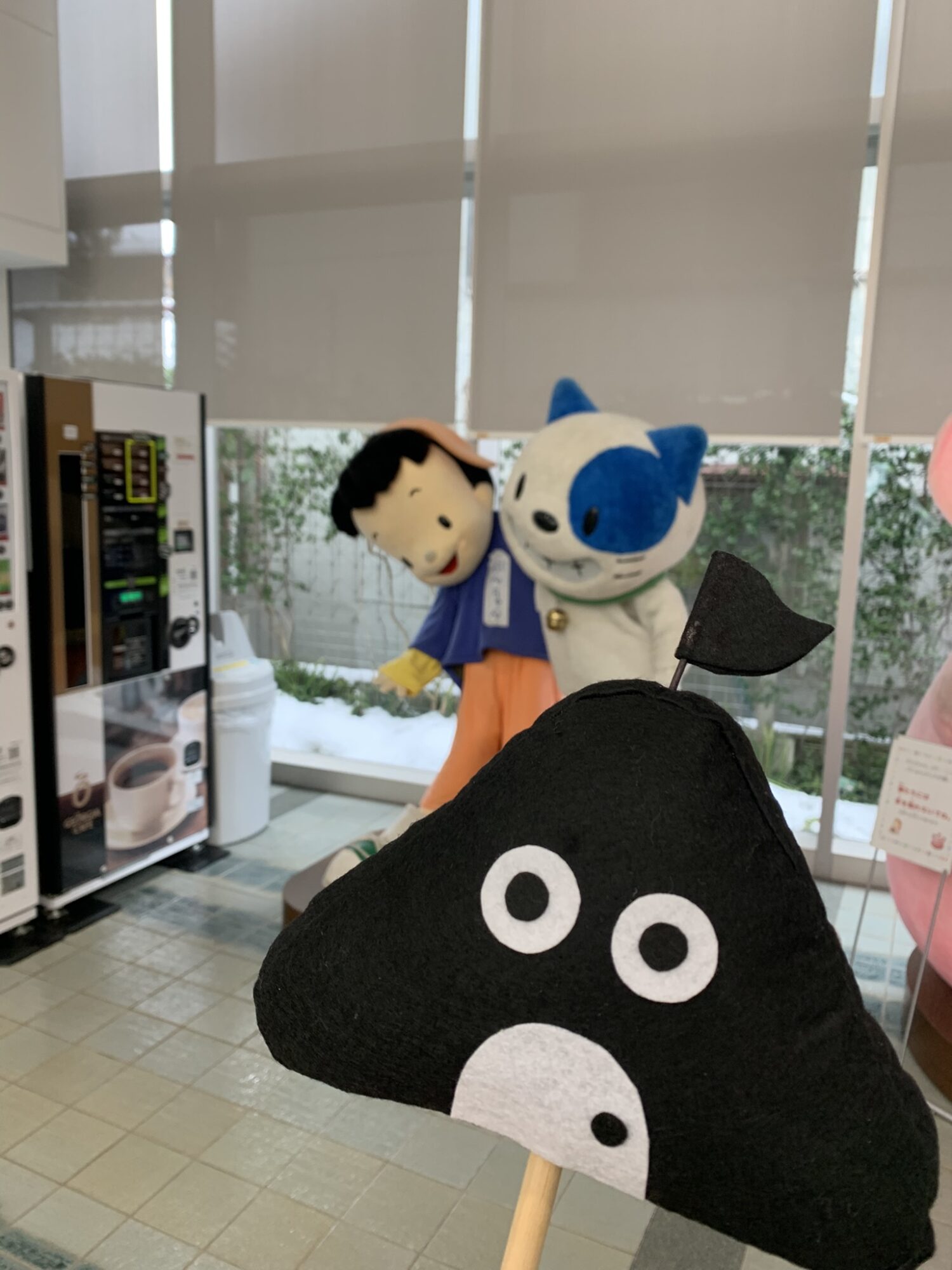 山形新聞の公式キャラクター、ぶんちゃん・ヨモ~ニャ先輩たちと記念撮影。心なしか、先輩たちも温かい目で見守ってくれている……気がします。