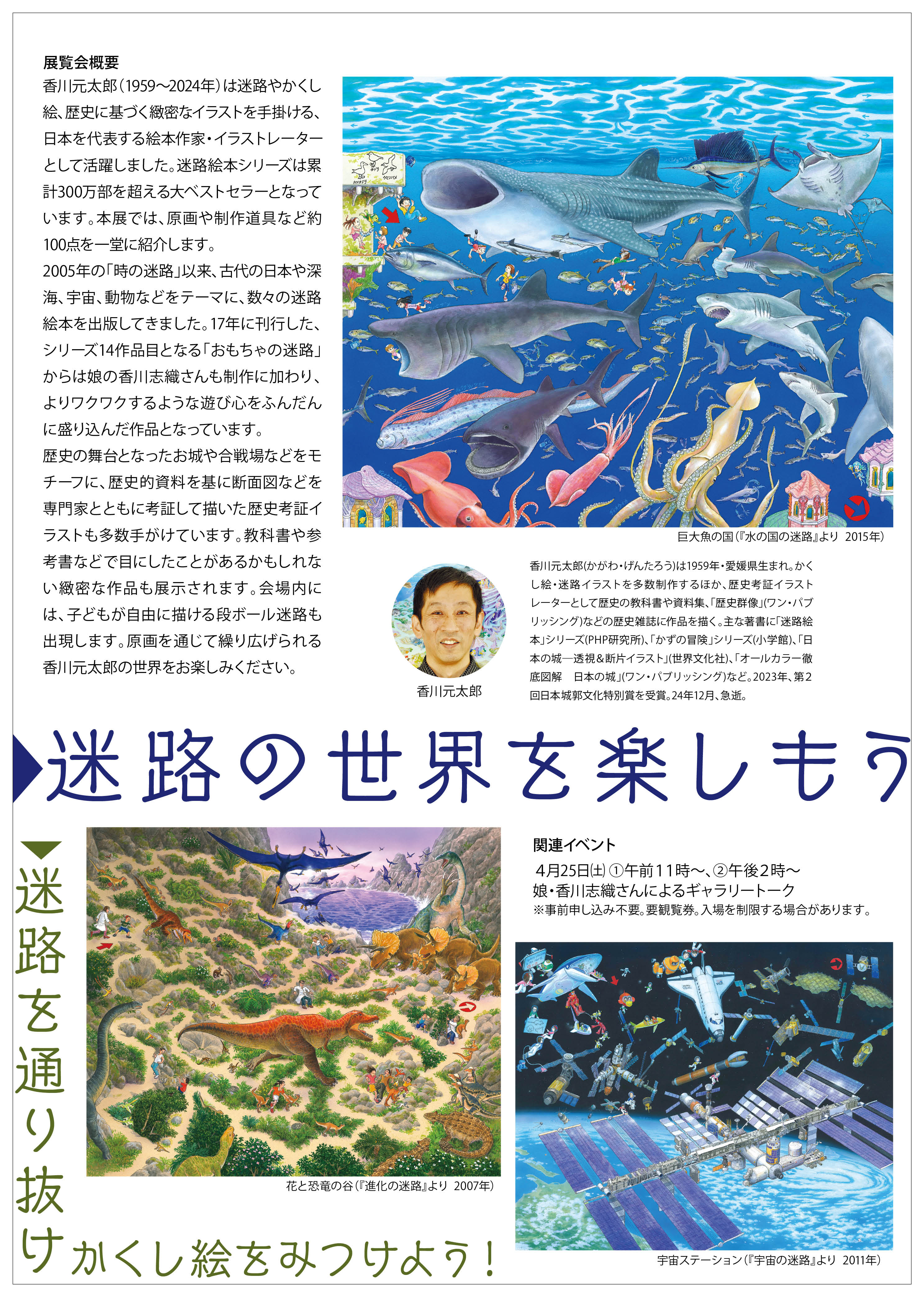 2005年の「時の迷路」以来、古代の日本や深海、宇宙、動物などをテーマに、数々の迷路絵本を出版してきました。シリーズ14作品目からは娘の香川志織さんも制作に加わっており、より遊び心がふんだんに盛り込まれています。