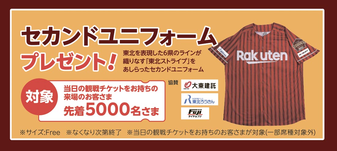 ご来場者先着5,000名様に「セカンドユニフォーム」をプレゼントいたします。東北を表現した6県のラインが織りなす「東北ストライプ」をあしらったデザインです。「セカンドユニフォーム」を着て、選手とひとつになって闘いましょう!